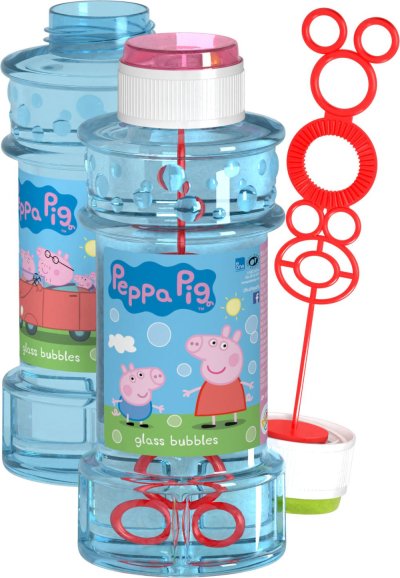 Bublifuk s motívom Peppa Pig s objemom 300 ml. Súčasťou farebného viečka je hra a fúkatko.