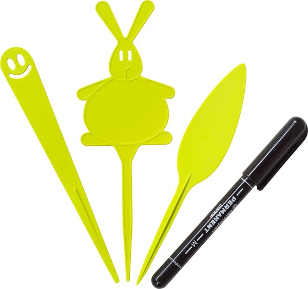 Menovky zapichovacie k popisom rastlín a výsevov. Sada obsahuje 9 kusov menoviek a liehový fix.