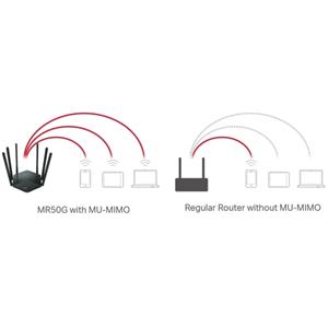 Kľúčové vlastnosti *Dvojpásmová rýchlosť AC1900 - Užívajte si domácu zábavu bez akéhokoľvek oneskorenia a dosahujte rýchlosťou až 1900 Mb/s (1300 Mb/sv pásme 5 GHz a 600 Mb/sv pásme 2,4 GHz) *Ďalekosiahle pokrytie - 6 × celom dome a poskytujú silný signál WiFi * Plne gigabitové porty - plne využite svoj prístup k internetu a prenášajte dáta závratnou rýchlosťou, aby ste dosiahli špičkový výkon * Vyššia sieťová efektivita - technológia MU-MIMO umožňuje MR50G komunikovať s viacerými zariadeniami súčasne, čo zvyšuje celkovú priepustnosť siete * Smart Connect - Inte