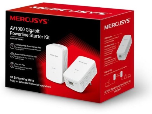 Mercusys MP500 KIT premení vašu existujúcu elektrickú sieť na vysokorýchlostnú internetovú sieť bez nutnosti ďalších káblov či vŕtania. Nie je potrebná žiadna konfigurácia, stačí len zapojiť adaptéry do elektrických zásuviek a okamžite tak vytvoriť sieťovú infraštruktúru. Prenosová rýchlosť powerline je až 1000 Mbps a na oboch stranách prináša 1x 10/100/1000Mbps ethernet na pripojenie do switcha, routera, počítača alebo iného zariadenia s RJ45 portom.