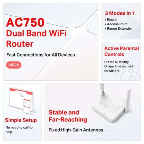 Jednotka MR20 vyhovuje špecifikáciám výkonného štandardu 802.11ac a vysiela rýchlu dvojpásmovú Wi-Fi sieť umožňujúcu prenosy dát rýchlosťou až 750 Mbit/s. Vyberte si pásmo 2,4 GHz (300 Mbit/s), ktoré prenáša signál s lepším prienikom múrov na dlhšiu vzdialenosť pri prezeraní internetu, posielanie e-mailov kolegom alebo zdieľanie odkazov na sociálnych sieťach. Pri streamovaní HD videa, hraní hier alebo iných úlohách náročných na šírku pásma zvoľte pásmo 5 GHz (433 Mbit/s), ktoré poskytuje vyššie rýchlosti s menším rušením.