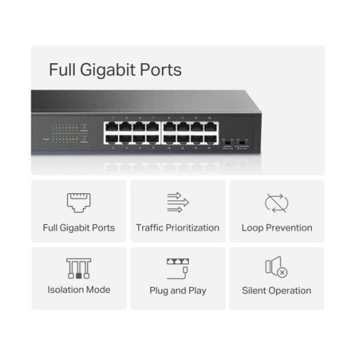 Plne gigabitové porty: 16× 10/100/1000 Mb/s port RJ45 s automatickým vyjednávaním a podporou Auto-MDI/MDIX.