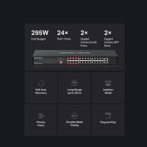 PoE Štandard: IEEE 802.3af / 802.3at PoE porty: 1–24 Výkon na port: až 30 W PoE rozpočet: 295 W