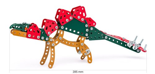 Dinosaurs Stegosaurus bol rod vtákopánveho dinosaura, ktorý žil v období neskorej jury – asi pred 150 miliónmi rokov na území Severnej Ameriky. Jeho pomenovanie znamená „strechovitý či zastrešený jašter“, toto označenie dostal podľa plochých dosiek, ktoré mal na krku, chrbte a prednej časti chvosta. Ponorte sa do sveta kreativity a zábavy so stavebnicou Stegosaurus od spoločnosti Merkúr. Táto jedinečná sada je ideálnym nástrojom na rozvoj technických zručností a predstavivosti detí. Vďaka kovovým dielikom si malí stavitelia môžu postaviť model dinosaura. Stavebnica obsahuje kvalitné kovové diely, ktoré sa ľahko spájajú skrutkami, čo podporuje rozvoj jemnej motoriky, logického myslenia a sústredenia. Sada obsahuje: 172 dielikov. Úroveň Merkúr obtiažnosti: 2. Balené v krabičke. Rozmery modelu: 12 x 28,5 x 12 cm. Rozmery balenia: 18 x 13 x 5,5 cm. Nevhodné pre deti do 3 rokov. Vek: 5+