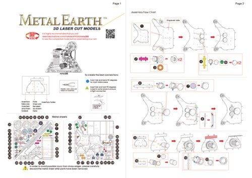 Jednotlivé diely vyberte z kovových plátkov, v prípade potreby použite malé štiepacie nožnice (nie sú súčasťou). Dieliky sa spájajú k sebe pomocou zámkov tvorených úchytom (zobáčikom) a otvorom. Zobáčik ohnite pomocou malých tenkých klieští (nie sú súčasťou) a postupne spojte všetky zámky až vznikne veľmi realistický majstrovský kúsok!