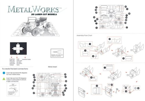 Jednotlivé diely vyberte z kovových plátkov, v prípade potreby použite malé štiepacie nožnice (nie sú súčasťou). Dieliky sa spájajú k sebe pomocou zámkov tvorených úchytom (zobáčikom) a otvorom. Zobáčik ohnite pomocou malých tenkých klieští (nie sú súčasťou) a postupne spojte všetky zámky až vznikne veľmi realistický majstrovský kúsok!