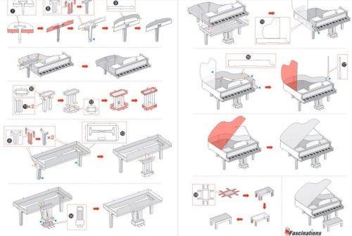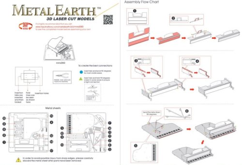 Jednotlivé diely vyberte z kovových plátkov, v prípade potreby použite malé štiepacie nožnice (nie sú súčasťou). Dieliky sa spájajú k sebe pomocou zámkov tvorených úchytom (zobáčikom) a otvorom. Zobáčik ohnite pomocou malých tenkých klieští (nie sú súčasťou) a postupne spojte všetky zámky až vznikne veľmi realistický majstrovský kúsok!