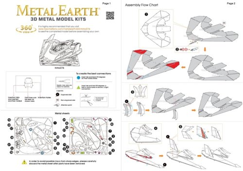 Jednotlivé diely vyberte z kovových plátkov, v prípade potreby použite malé štiepacie nožnice (nie sú súčasťou). Dieliky sa spájajú k sebe pomocou zámkov tvorených úchytom (zobáčikom) a otvorom. Zobáčik ohnite pomocou malých tenkých klieští (nie sú súčasťou) a postupne spojte všetky zámky až vznikne veľmi realistický majstrovský kúsok!