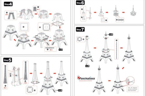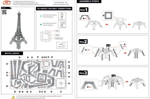 Jednotlivé diely vyberte z kovových plátkov, v prípade potreby použite malé štiepacie nožnice (nie sú súčasťou). Dieliky sa spájajú k sebe pomocou zámkov tvorených úchytom (zobáčikom) a otvorom. Zobáčik ohnite pomocou malých tenkých klieští (nie sú súčasťou) a postupne spojte všetky zámky až vznikne veľmi realistický majstrovský kúsok!