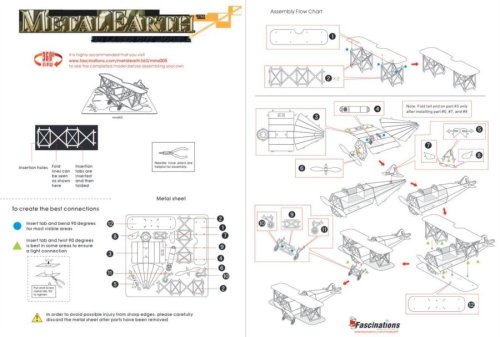 Jednotlivé diely vyberte z kovových plátkov, v prípade potreby použite malé štiepacie nožnice (nie sú súčasťou). Dieliky sa spájajú k sebe pomocou zámkov tvorených úchytom (zobáčikom) a otvorom. Zobáčik ohnite pomocou malých tenkých klieští (nie sú súčasťou) a postupne spojte všetky zámky až vznikne veľmi realistický majstrovský kúsok!