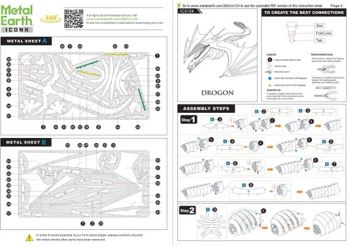 Vzrušujúca výzva, zážitok pri skladaní a oslnivý výsledok – to sú modely METAL EARTH! Model z prémiového radu ICONX Game of Thrones Vás očarí ešte dokonalejším spracovaním detailov! Stavba 3D puzzle METAL EARTH ICONX vyžaduje trpezlivosť a šikovné ruky. Výsledok práce však plne vyváža vynaložené úsilie! Miniatúrne repliky sú obzvlášť pôsobivou a pútavou dekoráciou nielen doma, ale aj v kancelárii či v škole. Z obdĺžnikových plátkov ocele (21 x 11 cm) s časťami svetových monumentov, slávnych dopravných prostriedkov, hudobných nástrojov či zvierat Vám pod rukami vyrastú detailne prepracované, fascinujúce modely. Autentický vzhľad 3D puzzle METAL EARTH ICONX je dosiahnutý vďaka detailnému laserovému gravírovaniu. Balenie obsahuje 2 oceľové plátky a návod na zloženie. Náradie nie je súčasťou balenia. PRACOVNÝ POSTUP: Jednotlivé diely vyberte z kovových plátkov, v prípade potreby použite malé štiepacie nožnice (nie sú súčasťou). Dieliky sa spájajú k sebe pomocou zámkov tvorených úchytom (zobáčikom) a otvorom. Zobáčik ohnite pomocou malých tenkých klieští (nie sú súčasťou) a postupne spojte všetky zámky až vznikne veľmi realistický majstrovský kúsok! Odporúčaný vek: od 14 rokov. Rozmer zloženého puzzle cca 21 x 19 x 4 cm
