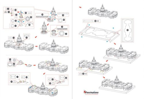 Jednotlivé diely vyberte z kovových plátkov, v prípade potreby použite malé štiepacie nožnice (nie sú súčasťou). Dieliky sa spájajú k sebe pomocou zámkov tvorených úchytom (zobáčikom) a otvorom. Zobáčik ohnite pomocou malých tenkých klieští (nie sú súčasťou) a postupne spojte všetky zámky až vznikne veľmi realistický majstrovský kúsok!