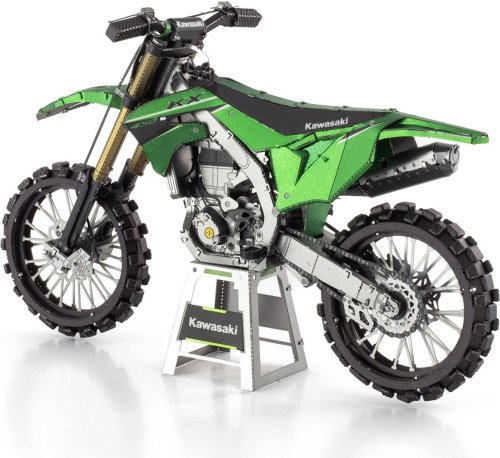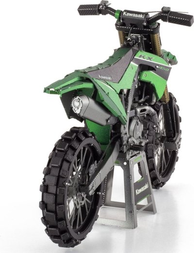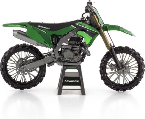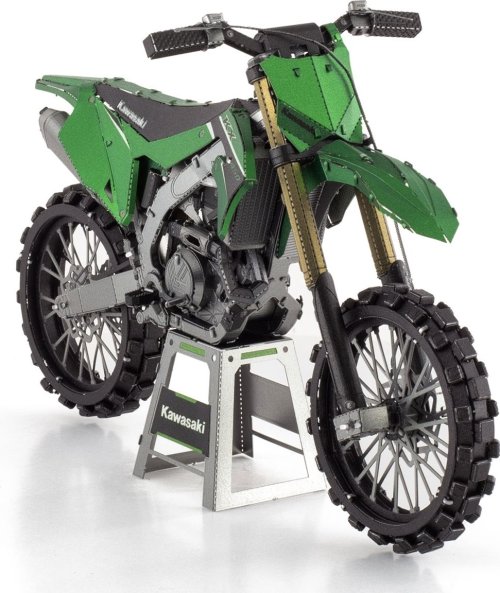 Kawasaki KX450 je terénny závodný motocykel s kvapalinou chladeným motorom DOHC. S objemom 449 cm³ je KX450 vlajkovou loďou motocrossovej a cross-country rady Kawasaki, ktorá získala viac titulov vo svojej triede ako akýkoľvek iný výrobca. Súprava na vytvorenie fascinujúceho kovového 3D modelu . Stavba puzzle METAL EARTH vyžaduje trpezlivosť a šikovné ruky. Výsledok práce však plne vyváža vynaložené úsilie. Miniatúrne repliky sú pôsobivou a pútavou dekoráciou. Zo štvorcových plátkov ocele Vám pod rukami vyrastú detailne prepracované, fascinujúce modely. Autentický vzhľad 3D puzzle METAL EARTH je dosiahnutý vďaka detailnému laserovému gravírovaniu. Náradie nie je súčasťou balenia. PRACOVNÝ POSTUP: Jednotlivé diely vyberte z kovových plátkov, v prípade potreby použite malé štiepacie nožnice (nie sú súčasťou). Dieliky sa spájajú k sebe pomocou zámkov tvorených úchytom (zobáčikom) a otvorom. Zobáčik ohnite pomocou malých tenkých klieští (nie sú súčasťou) a postupne spojte všetky zámky až vznikne veľmi realistický majstrovský kúsok! Rozmer zloženého puzzle cca 13 x 5 x 8 cm