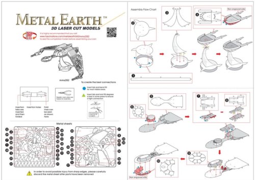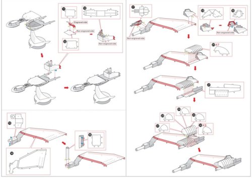 Jednotlivé diely vyberte z kovových plátkov, v prípade potreby použite malé štiepacie nožnice (nie sú súčasťou). Dieliky sa spájajú k sebe pomocou zámkov tvorených úchytom (zobáčikom) a otvorom. Zobáčik ohnite pomocou malých tenkých klieští (nie sú súčasťou) a postupne spojte všetky zámky až vznikne veľmi realistický majstrovský kúsok!