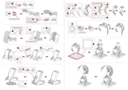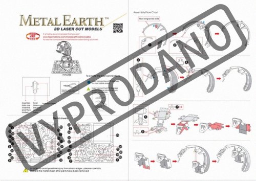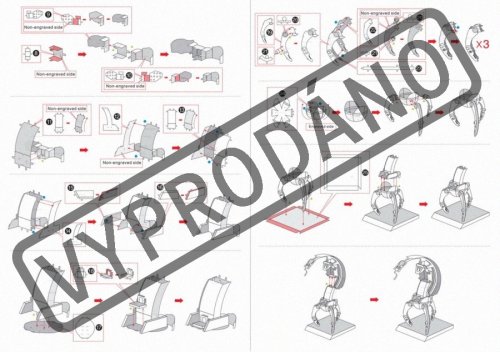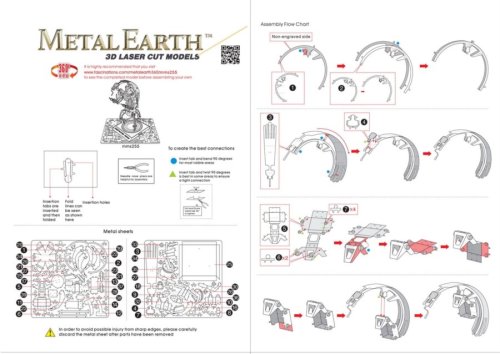 Jednotlivé diely vyberte z kovových plátkov, v prípade potreby použite malé štiepacie nožnice (nie sú súčasťou). Dieliky sa spájajú k sebe pomocou zámkov tvorených úchytom (zobáčikom) a otvorom. Zobáčik ohnite pomocou malých tenkých klieští (nie sú súčasťou) a postupne spojte všetky zámky až vznikne veľmi realistický majstrovský kúsok!