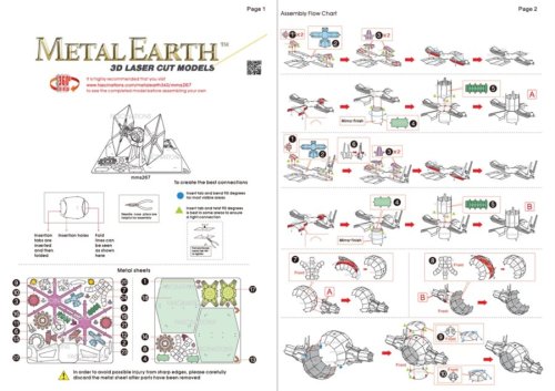 Jednotlivé diely vyberte z kovových plátkov, v prípade potreby použite malé štiepacie nožnice (nie sú súčasťou). Dieliky sa spájajú k sebe pomocou zámkov tvorených úchytom (zobáčikom) a otvorom. Zobáčik ohnite pomocou malých tenkých klieští (nie sú súčasťou) a postupne spojte všetky zámky až vznikne veľmi realistický majstrovský kúsok!