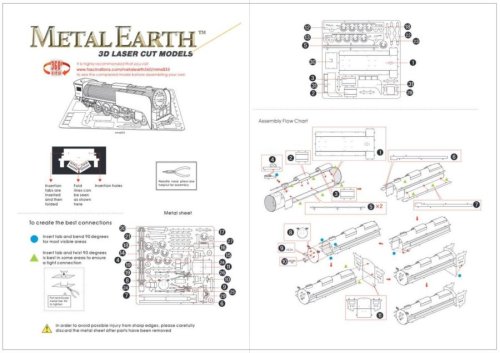 Jednotlivé diely vyberte z kovových plátkov, v prípade potreby použite malé štiepacie nožnice (nie sú súčasťou). Dieliky sa spájajú k sebe pomocou zámkov tvorených úchytom (zobáčikom) a otvorom. Zobáčik ohnite pomocou malých tenkých klieští (nie sú súčasťou) a postupne spojte všetky zámky až vznikne veľmi realistický majstrovský kúsok!