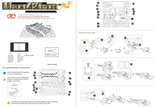 Jednotlivé diely vyberte z kovových plátkov, v prípade potreby použite malé štiepacie nožnice (nie sú súčasťou). Dieliky sa spájajú k sebe pomocou zámkov tvorených úchytom (zobáčikom) a otvorom. Zobáčik ohnite pomocou malých tenkých klieští (nie sú súčasťou) a postupne spojte všetky zámky až vznikne veľmi realistický majstrovský kúsok!