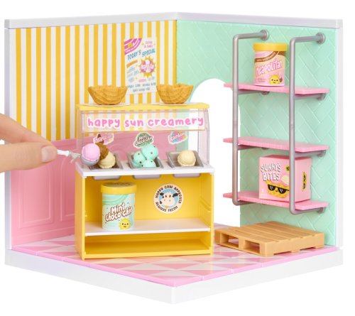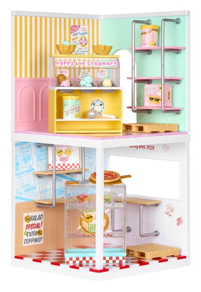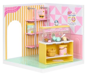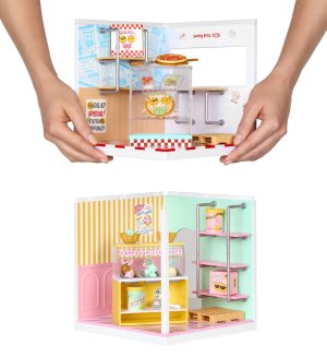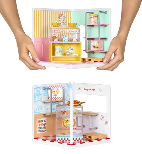S Mini Miestnosťami môžeš vytvoriť vlastný svet pre Miniverse miniatúry! Tento set ti umožní nielen vystaviť svoje zberateľské kúsky, ale aj postaviť si tematickú miestnosť podľa vlastnej fantázie. Balenie obsahuje podlahu, steny, obklady aj tapety. Stačí položiť dlaždice, pripevniť steny a panely a rozmiestniť police podľa svojich predstáv. Pizza shop obsahuje materiál a komponenty pre pizzeriu. Zmrzlinový stánok zase pre zmrzlináreň.