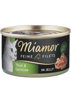 Konzerva s filetami z tuniaka a zeleninou, doplnkové krmivo pre dospelé mačky.