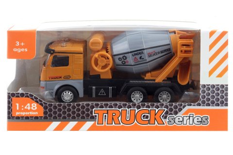 Prepracovaný model stavebného auta-miešačky na zotrvačník. Kombinácia kovu a plastu. Balené v krabičke. Rozmery balenia cca 19x9x7,5 cm. Rozmery auta 14x6x6 cm. Vek 3+