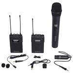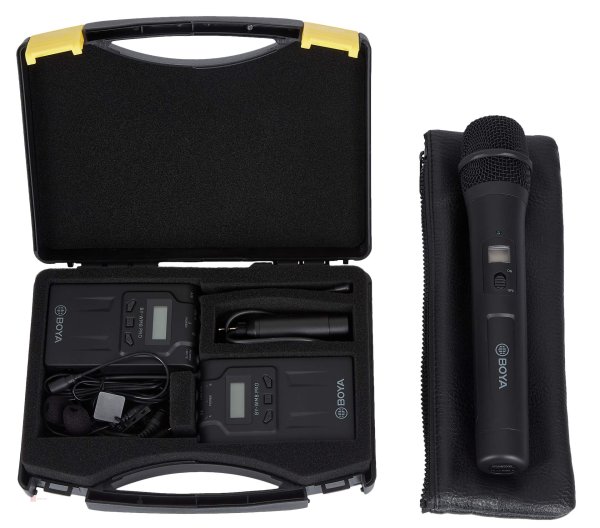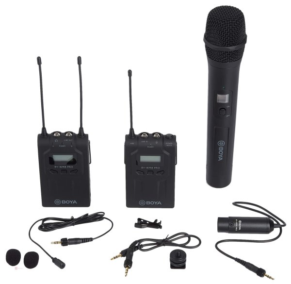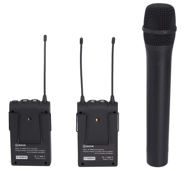 Vokálny bezdrôtový set Boya BY-WM8 PRO-K4 sa skladá z ručného mikrofónu, bezdrôtového prijímača s klopovým mikrofónom a vysielača. Prijímač je vybavený držiakom kamery, slúchadlovým výstupom pre priamy monitoring a 3,5 mm jackovým výstupom. Na mikrofóne potom nájdete integrovaný OLED displej s prehľadnými informáciami o stave batérie alebo používanom kanáli. Vreckový vysielač má široké prepínacie pásmo RF, vstupy Mic/Line a digitálne obvody. Dômyselné ovládanie pilotného tónu vám pomáha udržať integritu vášho zvuku, vďaka čomu sa vyhnete dráždivému rušeniu signálu.