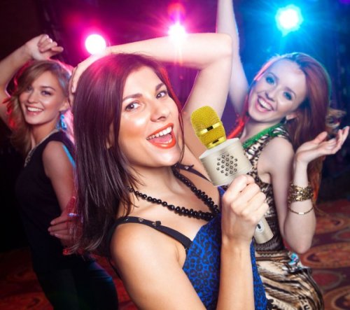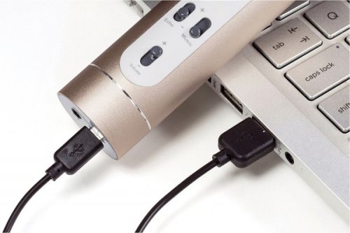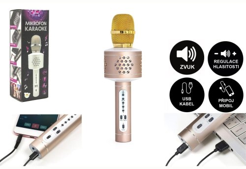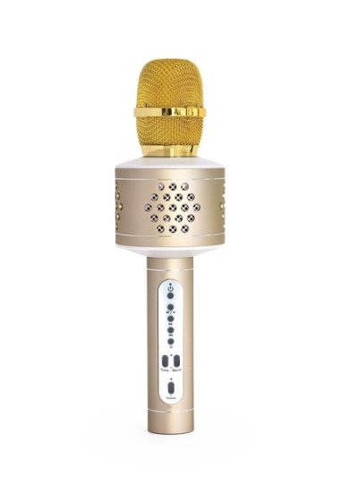 Bezdrôtový karaoke mikrofón nesmie chýbať na žiadnej párty. Pomocou kábla alebo Bluetooth prepojíte svoj telefón s mikrofónom. AUX konektor pre prehrávanie hudby z mobilného telefónu, PC, tabletu alebo MP3/MP4 prehrávača. Obsahuje slot pre TF card - zapnite mikrofón dlhším stlačením tlačidla ON, vložte pamäťovú kartu a mikrofón začne prehrávať hudbu uloženú na karte. Môžete začať spievať spoločne s mikrofónom. AUX konektor - zapojte kábel s koncovkou do AUX slotu a druhú koncovku USB do mobilu, tabletu, PC alebo MP3. Mikrofón začne prehrávať hudbu, ktorú si v pripojenom zariadení vyberiete a môžete začať spievať. Pri zapnutí mikrofónu Bluetooth pracuje spontánne. Ak spojenie nenadviaže, hľadá iné Bt spojenie. Ak mikrofón nemôžete spárovať, skontrolujte, či zariadenie, s ktorým chcete mikrofón spárovať podporuje A2DP. Možné nastavenie hlasitosti a intenzity hudby a ozveny. Technické údaje: