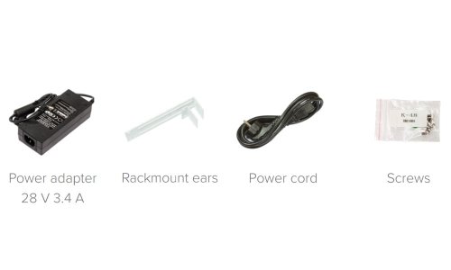 Súčasťou balenia je príslušenstvo pre montáž do racku, napájací adaptér a napájací kábel do siete 230 V.
