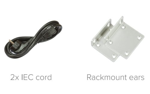 Súčasťou balenia sú dva držiaky na montáž do racku a dva napájacie káble do siete 230 V.
