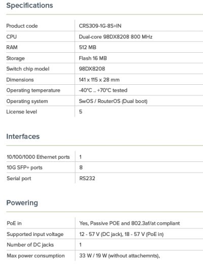 Z podporovaných funkcií a vlastností: • 8x SFP+ portov • 1x manažment Ethernet port s PoE • Switching capacity: 162 Gbps • Maximum power consumption: 19 W (s 33 W) • Supports PoE+ IEEE 802.3at/af and V • Metal enclosure • Fanless