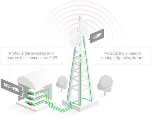 Here's what a typical use-case would be like. You have a masť with some antennas. And some switches on the ground. Put the GESP surge protector up there. It comes sealed inside a new and improved IP67 weatherproof enclosure. Vaše antény sú teraz bezpečné during a lightning búrka. Now add the GESP+POE-IN injector pred masťou - to protect switches and to power the antennas.