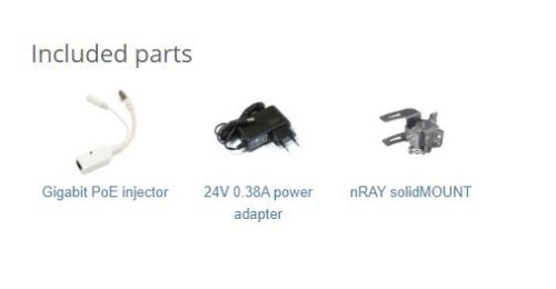 Obsah balenia (2x) Zariadenie s L3 licenciou (2x) Napájací adaptér 24V/0.38A (2x) Gigabitový PoE injektor (2x) kovový precízny držiak s jemným ladením