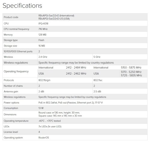 Popis produktu RBcAPGi-5acD2nD/cAP ac (stropný Access Point) je stropný dual band AP od MikroTiku s modulačnými rýchlosťami 300 Mbps (2.4GHz) a 866Mbps (5GHz). Navrhnuté bolo tak, aby maximálne splynulo s miestom inštalácie, ideálne pre hostinské činnosti, ako reštaurácie, hotely, letiská, nákupné centrá, atď... cAP ac podporuje 802.11a/b/g/n/ac a môže byť napájané pomocou pasívneho PoE . Je to ideálne zariadenie pre MikroTik CAPsMAN (riadený správca AP systému), ktorý umožňuje ovládať všetky AP zariadenia z jedného centrálneho miesta.