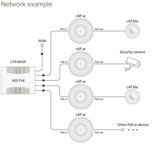 PoE Out Oproti ostatným cAP jednotkám má tento model 2 ethernetové porty s podporou PoE. PoE IN na prvom porte podporuje napájanie ako pomocou aktívnych noriem 802.3af/at, tak aj pasívneho napájania 17 až 57V DC. Druhý port s funkciou PoE Out môže napájať ďalšie zariadenia s rovnakým napätím ako na prvom porte, avšak iba pomocou pasívneho PoE.