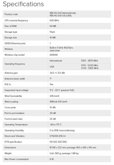 Popis produktu The Light Head Grid (LHG) je kompaktné a ľahké bezdrôtové zariadenie s integrovanou 24,5 dBi mriežkovitou anténou zaisťujúcou veľkú ochranu proti vetru. Je ideálny pre point-to-point spojenie alebo pre klientov/zákazníkov na dlhšie vzdialenosti.