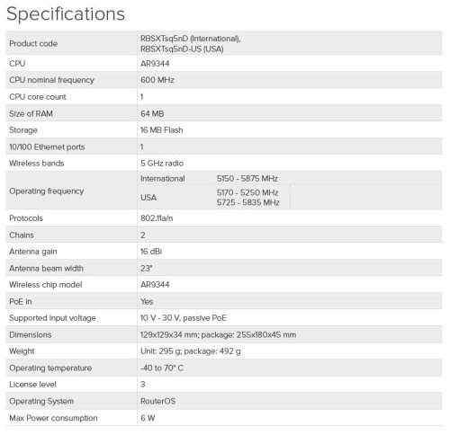 Outdoor jednotka s integrovaným 5GHz modulom 802.11a/n (MIMO2x2) a vrátane systému RouterOS Mikrotik V6 L3. Integrované vo vodotesnom, UV odolnom boxe s integrovanou duálnou 5 GHz anténou so ziskom 16 dBi a výstupom až 25 dBm.