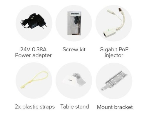 Jednotky disponujú integrovaným PoE splitterom pre PoE napájanie po UTP kábli, tiež podporujú štandard 802.3af/at. Súčasťou dodávky napájací zdroj, PoE injektor, držiak, inštalačné pásky a bezpečnostná skrutka eliminujúca neoprávnené vniknutie do zariadenia.