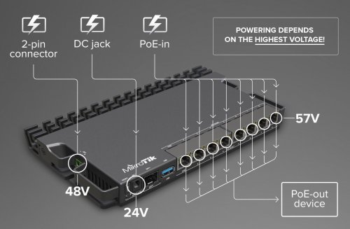 Kľúčové vlastnosti Malé, odolné a výkonné zariadenie s ARM 64bit architektúrou CPU 1400 MHz, 4 jadrá, 1 GB RAM, 1 GB NAND 3 typy napájania - DC jack, svorkovnica, PoE (24 až 57 V DC) PoE IN a PoE out na všetkých ôsmich ethernetových portoch! Pasívne chladenie bez ventilátorov Rozhranie: (7) Gigabit, (1) 2.5Gigabit, (1) SFP/SFP+, (1) USB 3.0 Predinštalovaný RouterOS L5, verzia 7 Možnosť inštalácie do 19" racku s dokúpiteľným príslušenstvom