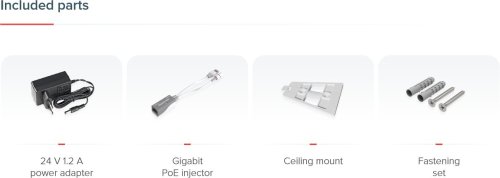 Súčasti dodávky: • Access Point • 24 V 1.2 A power supply • Ceiling mount • Gigabit PoE injector • Fastening set
