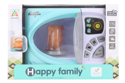 Plastová mikrovlnná rúra na batérie. Po zapnutí sa točí a svieti. Súčasťou je aj plastové kura. Napájanie na 2 AA batérie (nie sú súčasťou). Rozmery balenia cca 25 x 17 x 14 cm. Vek 3+