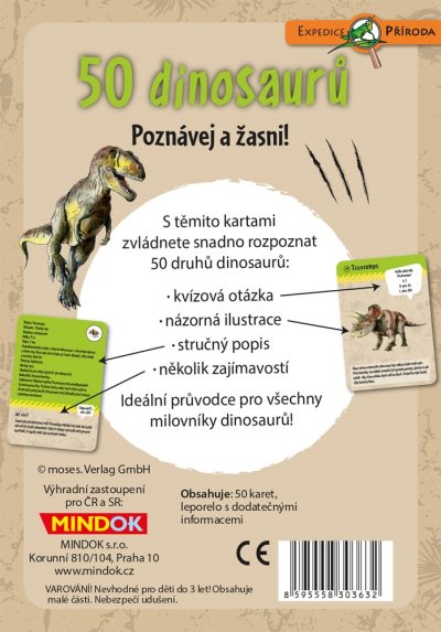 S týmito kartami zvládnete ľahko rozpoznať 50 druhov dinosaurov. Ideálny sprievodca pre všetkých milovníkov dinosaurov! Balenie obsahuje: 50 kariet, leporelo s dodatočnými informáciami.