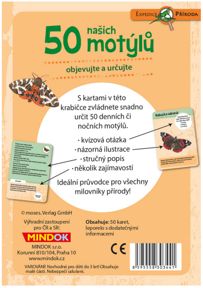 S kartami v tejto krabičke zvládnete ľahko určiť 50 denných či nočných motýľov. Na kartách nájdete kvízovú otázku, názornú ilustráciu, základné informácie a tiež niekoľko zaujímavostí. Ideálny sprievodca pre všetkých milovníkov prírody! Balenie obsahuje: 50 kariet, leporelo s dodatočnými informáciami.