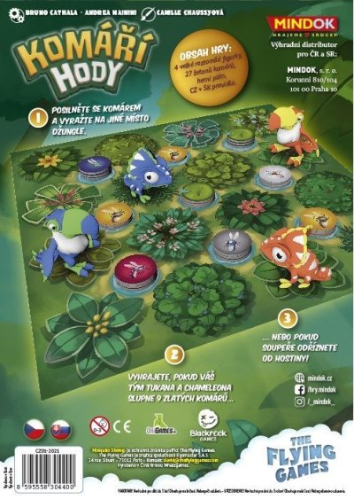 V temnej džungli, v tej zradnej džungli, tam vták komáre jejííí… V hre Komárej hody sa každý z dvoch hráčov chopí jedného loveckého tímu, pozostávajúceho z tukana a chameleóna, a vydajú sa nachytať si z jazierok lahodné komáre. Tí najväčší fajnšmekri si pochutnajú na vyhlásenej delikatese: zlatých komároch. Obsah balenia: