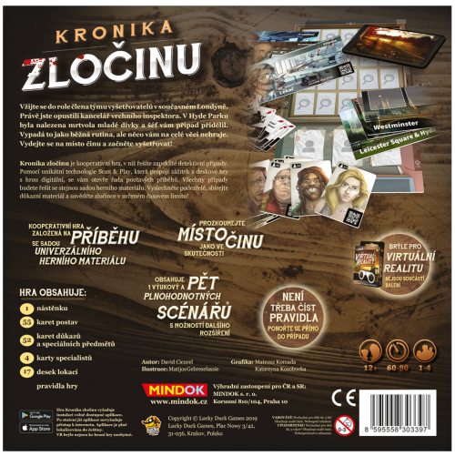 Vžite sa do úlohy člena tímu vyšetrovateľov v súčasnom Londýne. Práve ste opustili kanceláriu vrchného inšpektora. V Hyde Parku bola nájdená mŕtvola mladého dievčaťa a šéf vám prípad pridelil. Vyzerá to ako bežná rutina, ale niečo vám na celej veci nehrá. Vydajte sa na miesto činu a začnite vyšetrovať! Kronika zločinu je kooperatívna hra, v ktorej riešite zapeklité detektívne prípady. Pomocou unikátnej technológie Scan +amp; Play, ktorá prepojí zážitok z doskovej hry s hrou digitálnou, sa vám otvorí rad pútavých príbehov. Všetky prípady budete riešiť s rovnakou sadou herného materiálu. Vypočujte podozrivé, zbierajte dôkazný materiál a usvedčte zločincov v určenom časovom limite!