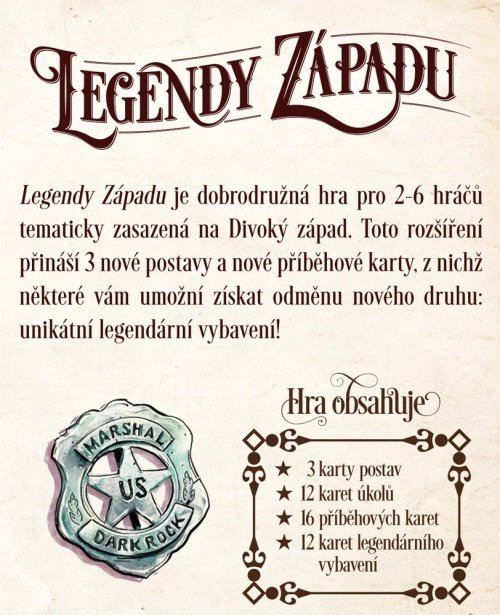 Legendy Západu je dobrodružná hra pre 2-6 hráčov tematicky zasadená na Divoký západ. Toto rozšírenie prináša 3 nové postavy a nové príbehové karty, z ktorých niektoré vám umožnia získať odmenu nového druhu: unikátne legendárne vybavenie! Balné obsahuje: