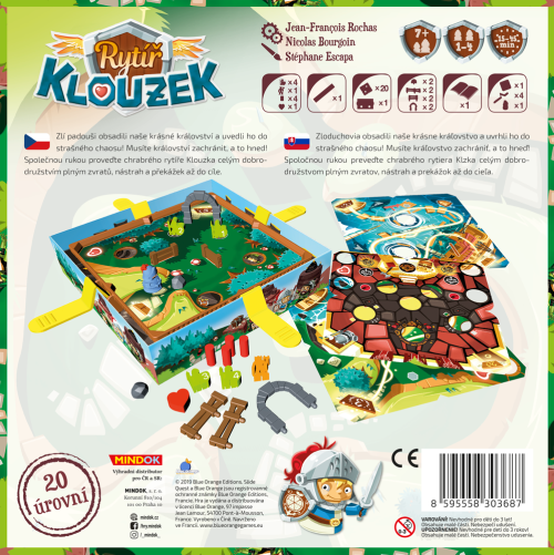 Zlí zloduchovia obsadili naše krásne kráľovstvo a uviedli ho do strašného chaosu. Musíte kráľovstvo zachrániť, a to hneď! Spoločnou rukou vykonajte chrabrého rytiera Kĺzka celým dobrodružstvom plným zvratov, nástrah a prekážok až do cieľa. Vykonajte rytiera celou trasou na každej mape od štartu k cieľu tak, aby sa vyhol všetkým pasciam, prekážkam a nástrahám. Trasu určuje chodník vyznačený svetlou čiarou. Ak sa vám podarí doraziť až do cieľa poslednej mapy s aspoň jedným zostávajúcim životom, vyhrali ste. Obsah balenia: 1 doska s pascami, 4 plastové páky, 20 máp znázorňujúcich 4 rôzne prostredia, 1 figúrka rytiera, 8 prekážok (2 brány, 2 veľké ohrady, 2 malé ohrady a 2 balvany), 9 nástrah (4 výbušné míny, 4 banditi očíslovanie 1–4 a 1 figúrka vodcu banditov), 1 počítadlo životov (s vyznačenými tromi úrovňami obtiažnosti), 1 srdiečko, 1 mechanický ukazovateľ pre uloženie rozohranej hry.