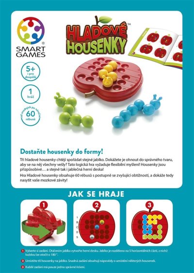 Dostaňte húsenice do formy! Tri hladné húsenice chcú zjesť rovnaké jablko. Dokážete ich ohnúť do správneho tvaru, aby sa naňho všetky zmestili? Táto logická hra vyžaduje flexibilné myslenie! Húsenice sú prispôsobivé… a rovnako tak aj jablčná herná doska! Hra Hladné húsenice obsahuje 60 rébusov s postupne sa zvyšujúcou obtiažnosťou, a dokáže teda nasýtiť vaše mozgové závity! Hra Hladné húsenice patria do skupiny logických hier Smart games, ktoré sú určené predovšetkým pre jedného hráča. Logické hry Smart Games obsahujú vždy zadanie v niekoľkých rôznych stupňoch obtiažnosti, rozvíja IQ, logické myslely, priestorovú predstavivosť, koncentráciu a plánovanie. Pravidlá hry: