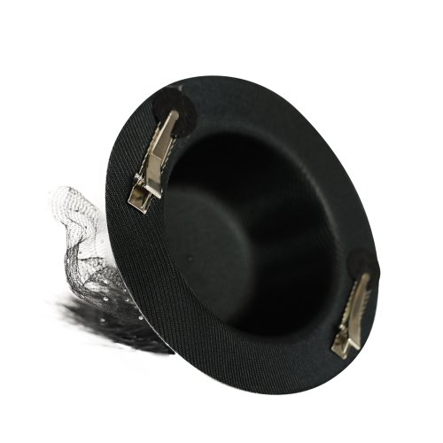 Mini klobúčik striebornej farby s čiernou stuhou, perím a tylom je doplnený šperkom. Pripevniť klobúčik k vlasom je možné pomocou dvoch sponiek.
