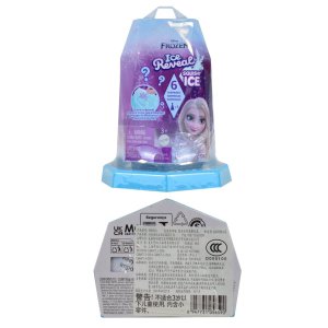Mini Panenka Disney Ledové království Colour Reveal 9 cm – panenka je charakteristická tajemstvím a interaktivním rozbalováním. Panenka je ukryta v neprůhledné vrstvě (např. bílý, sněhu podobný povlak), která se po ponoření do vody smyje a odhalí, kterou postavu (Elsu nebo Annu) a jaký outfit dítě získalo.Balení obvykle obsahuje 6 překvapení – 1× panenka, 1× kamarád (Olaf nebo malý Sven), 4× doplňky (plášť, diadém atd.).