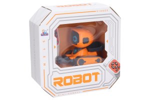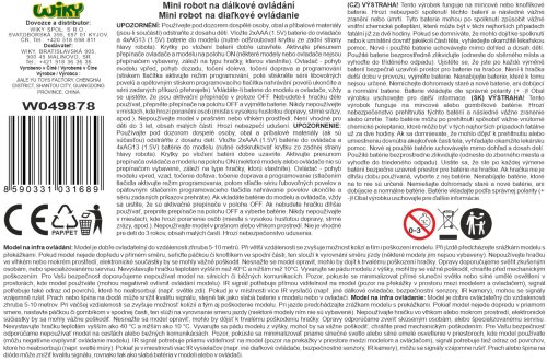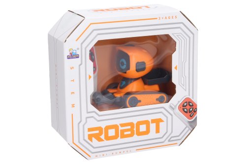 Mini robot RC na diaľkové ovládanie. Rozmery 7,5x12x9,5 cm. Infračervený port. Svetelné a zvukové efekty. 4xAG13 batérie do robota súčasťou, 2xAAA do ovládača nie je súčasťou. Ovládač - ON/OFF tlačidlo, programovacie tlačidlo, chôdza všetkými smermi.